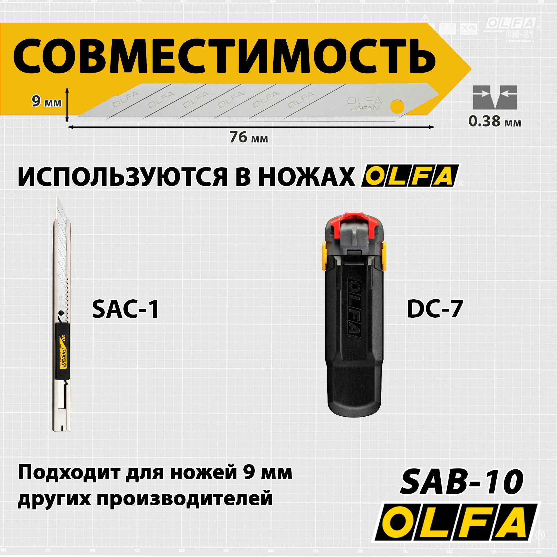 Лезвия OLFA SAB-10 сегментированные для графических ножей 9 мм, 7 сегментов, 10 штук, инструментальная сталь информация: