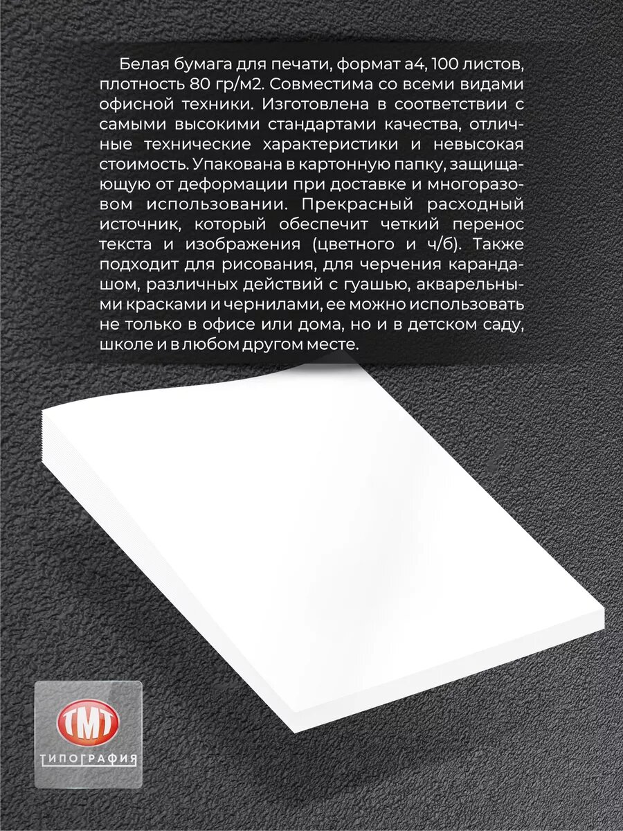 Бумага а4 для принтера от бренда Типография "ТМТ", цвет белый, 100 листов информация: