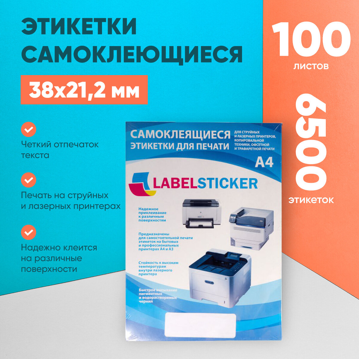 Этикетка самоклеящаяся 38х21,2 65шт. на листе А4, 100 листов в упаковке. Бумажная матовая самоклейка для маркировки. информация: