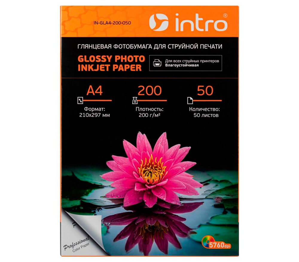 Фотобумага Intro GLA4-200-050, A4 глянцевая 200г/м2, 50 листов информация: