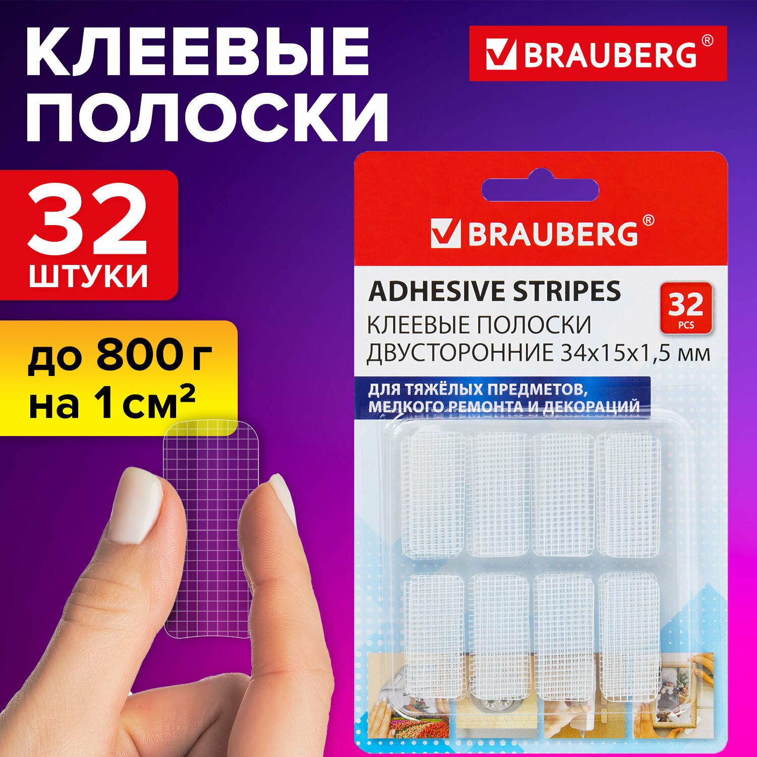 Клеящие подушечки, клеевые полоски, клейкие пластины 32 штуки двусторонние белые, 34х15 мм, акриловая основа, бесследное удаление, Brauberg, 608778 информация: