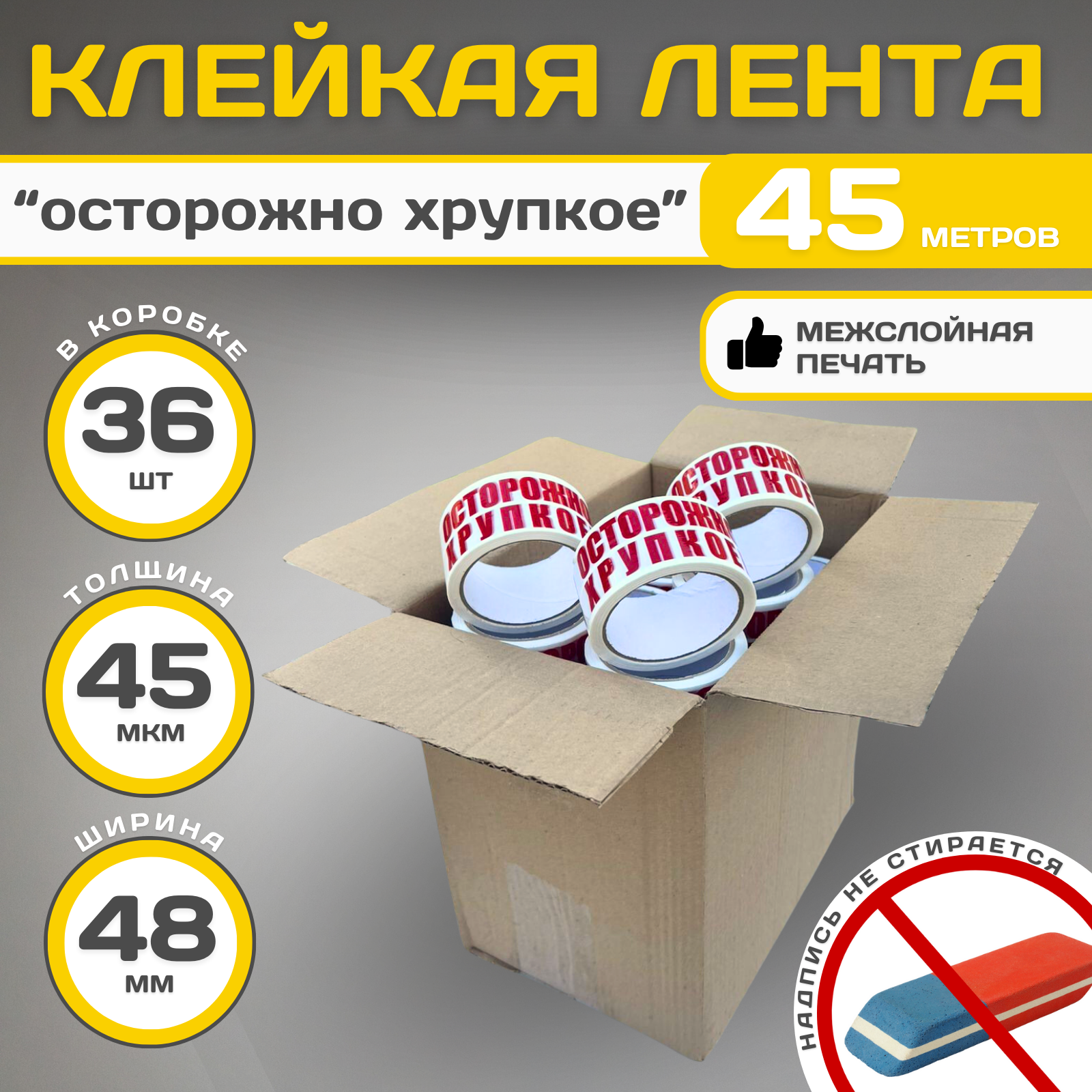Клейкая лента(скотч) с надписью"Осторожно хрупкое" 36 шт.(МЕЖСЛОЙНАЯ ПЕЧАТЬ) информация: