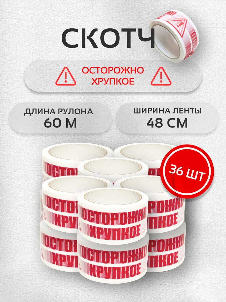 Скотч осторожно хрупкое с надписью 36 рулонов информация: