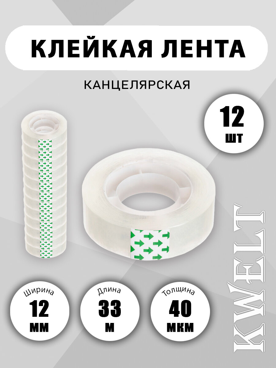 Скотч прозрачный односторонний Kwelt, 12 х 33, 40 мкм, 12 штук информация: