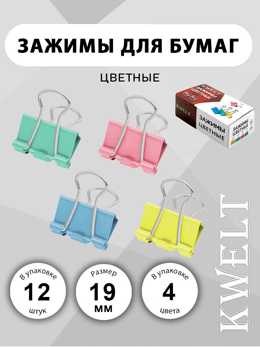 10 цен на Зажимы канцелярские " KWELT " разноцветные 19мм 12шт/уп, картонная упаковка