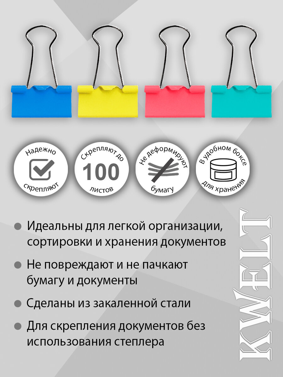 Зажимы канцелярские, металлические KWELT 19 мм, ассорти 40 шт. 324 ₽