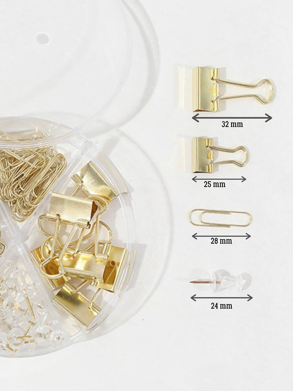 Отзывы на Набор канцелярский золотой из 4-х предметов-скрепки, зажимы 2 вида, кнопки (К0011-041)