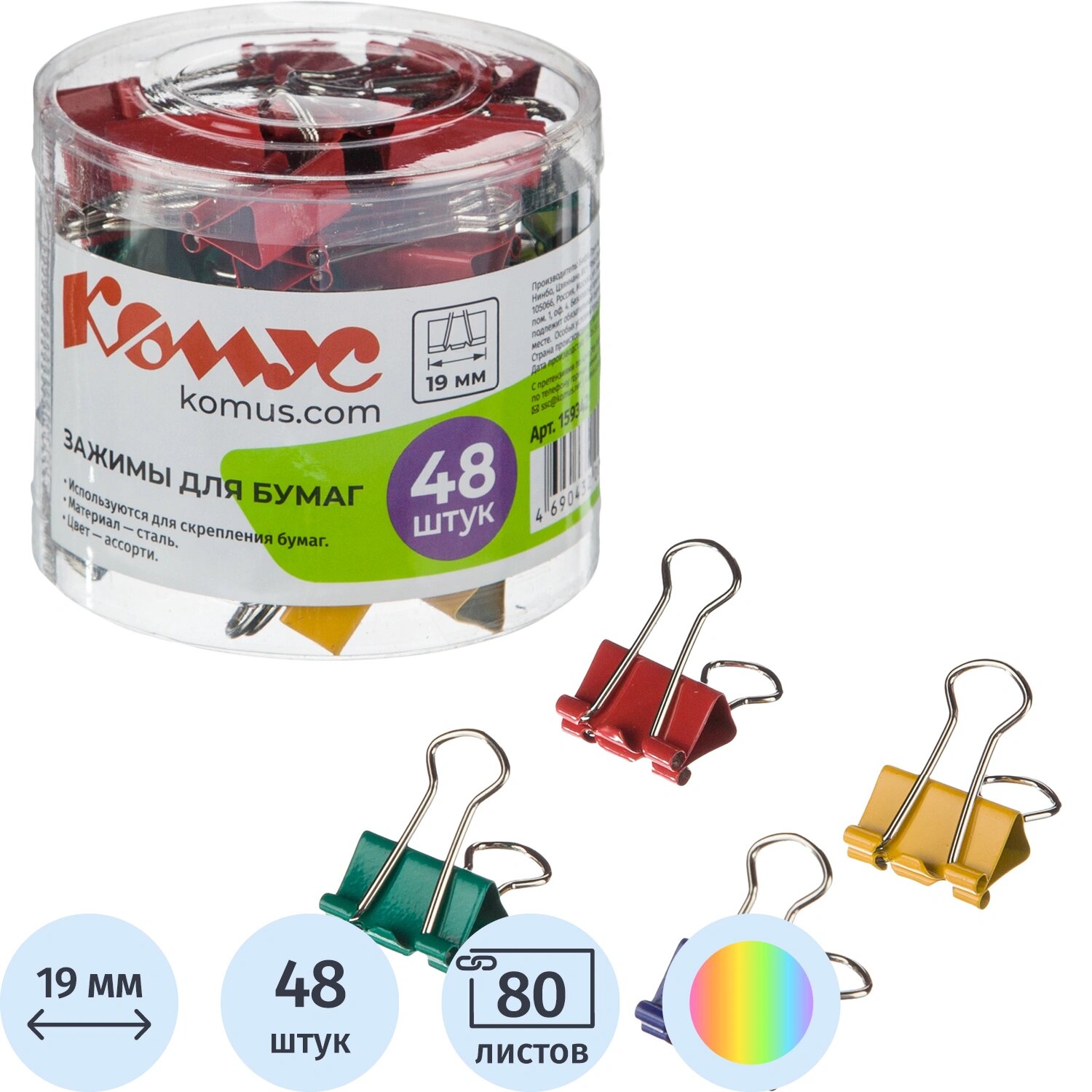 Зажимы для бумаг 19мм 48шт./уп. Комус цветные, в пласт. боксе информация: