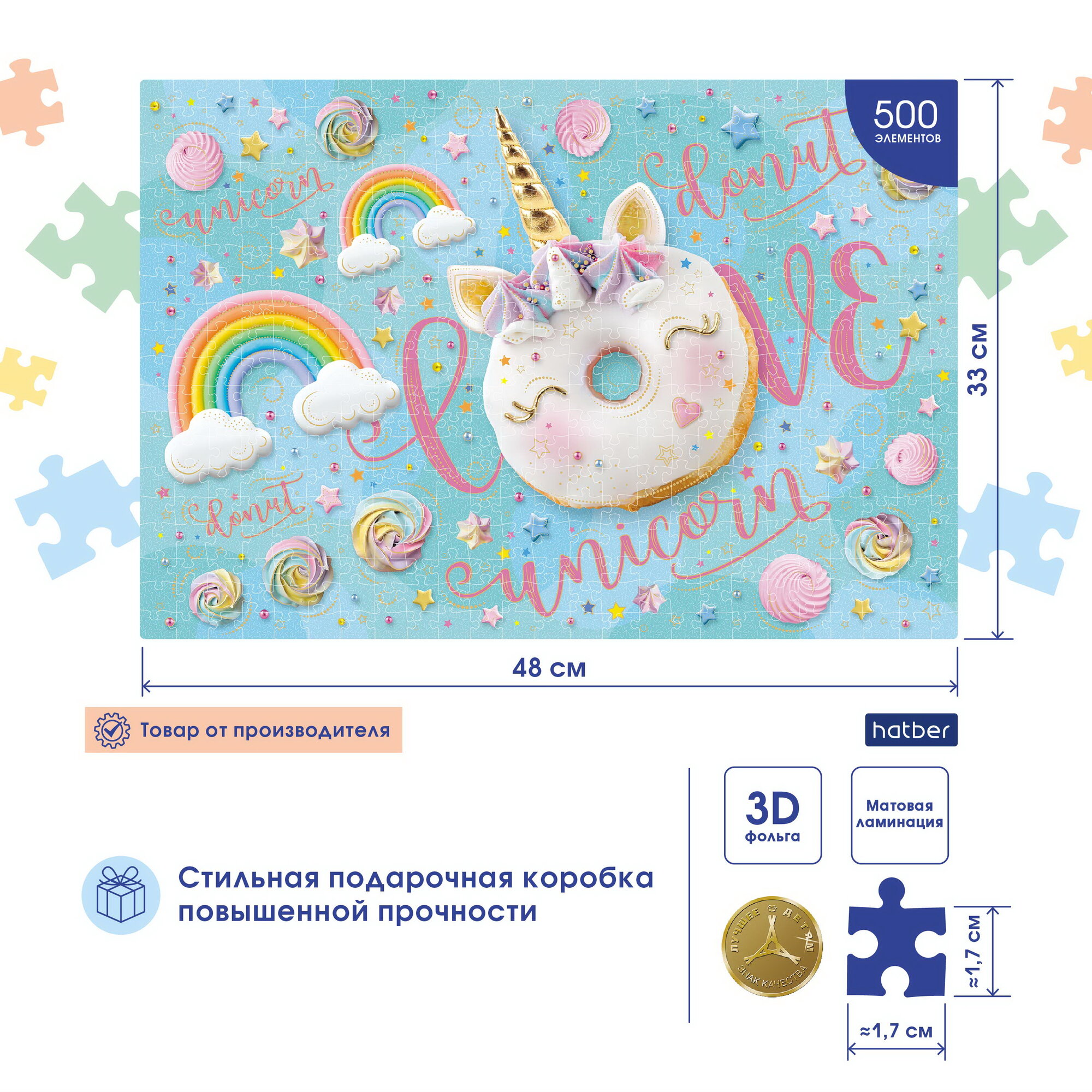 Пазл Hatber Premium LUX матовая ламинация, 3D фольга 330х480 мм -Sweet unicorn- 500 элементов информация: