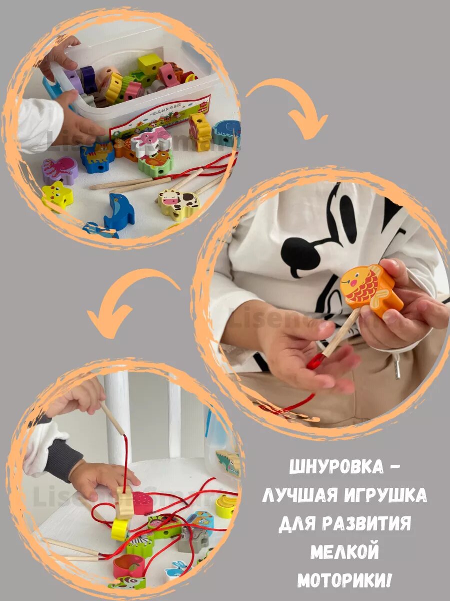 Развивающая шнуровка LisenokSmart, дерево/пластик/текстиль, 42 предмета, контейнер, от 3 лет, для детей и малышей информация: