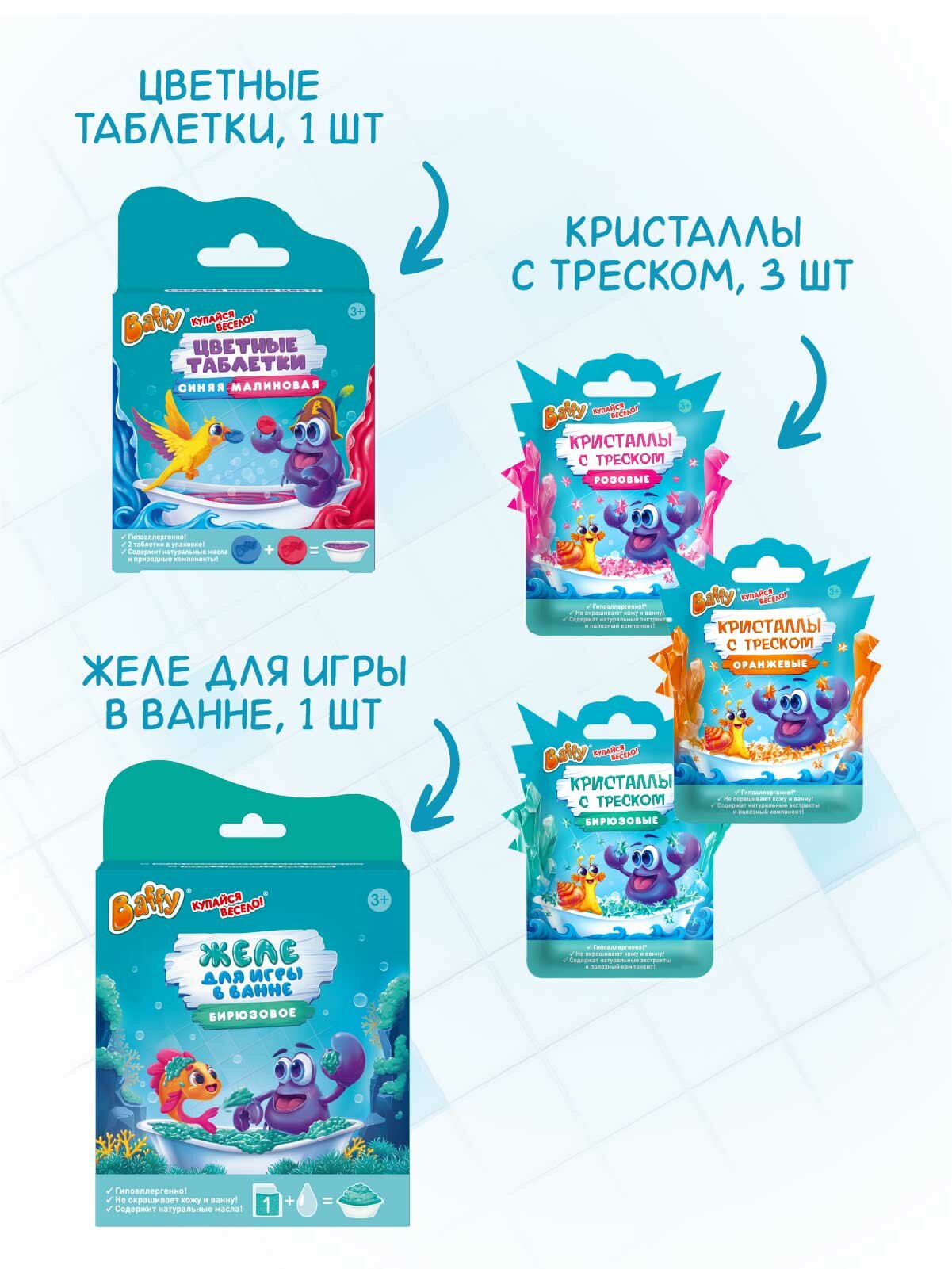 | Комплектация | желе для игры в ванне - 1шт, кристаллы с треском - 2шт, цветные таблетки - 1шт, бумага для упаковки подарка - 1шт |