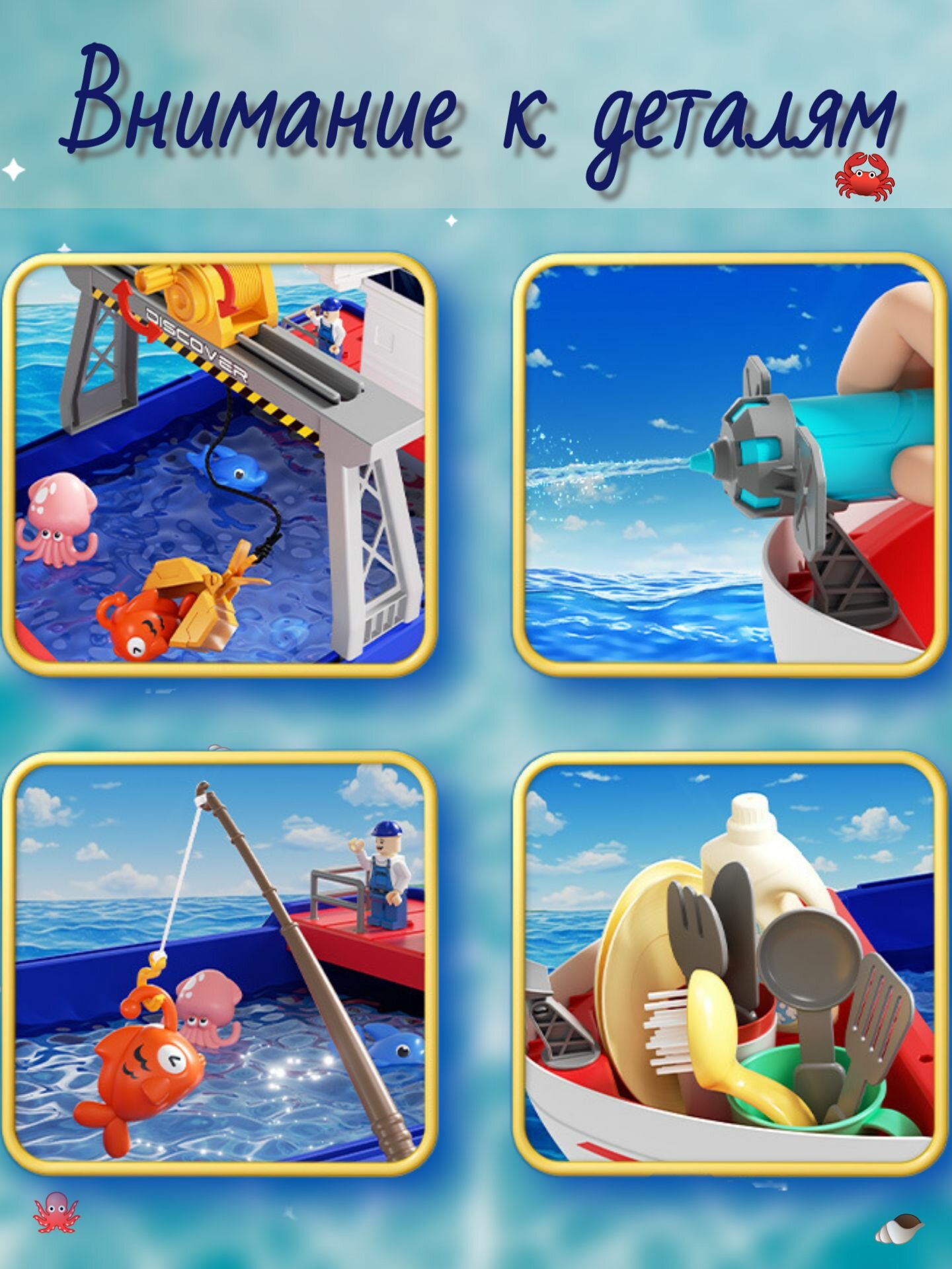 | Подробная комплектация | фигурки морских жителей. посуда, лодка, удочка, коробка, наклейки для лодки |