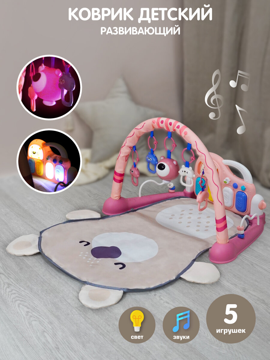 Развивающий коврик для новорожденных с пианино свет звук, Veld Co / Игровой коврик 1 дуга, 5 игрушек Зайка с морковкой
