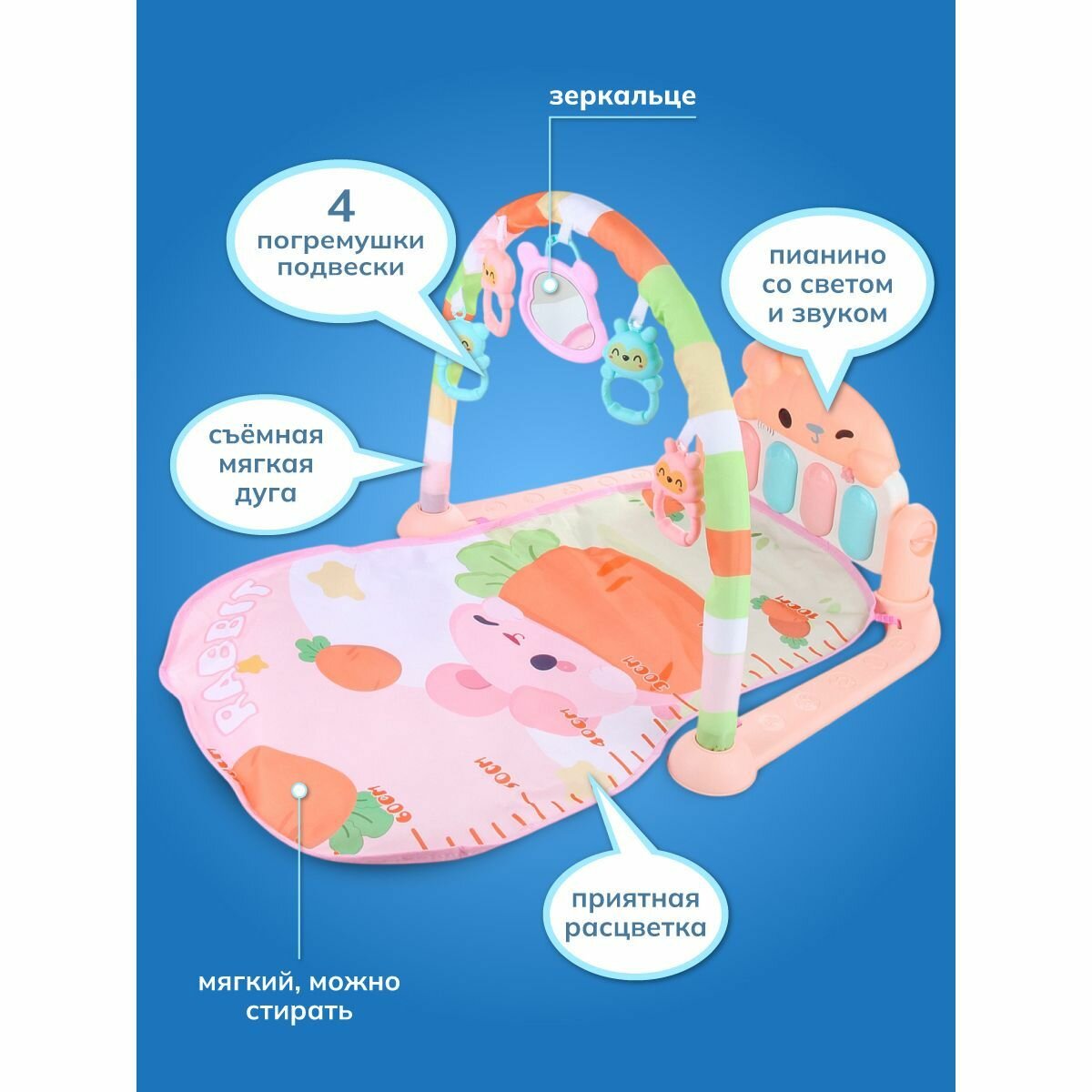 Развивающий коврик для новорожденных с пианино свет звук, Veld Co / Игровой коврик 1 дуга, 5 игрушек Зайка с морковкой информация: