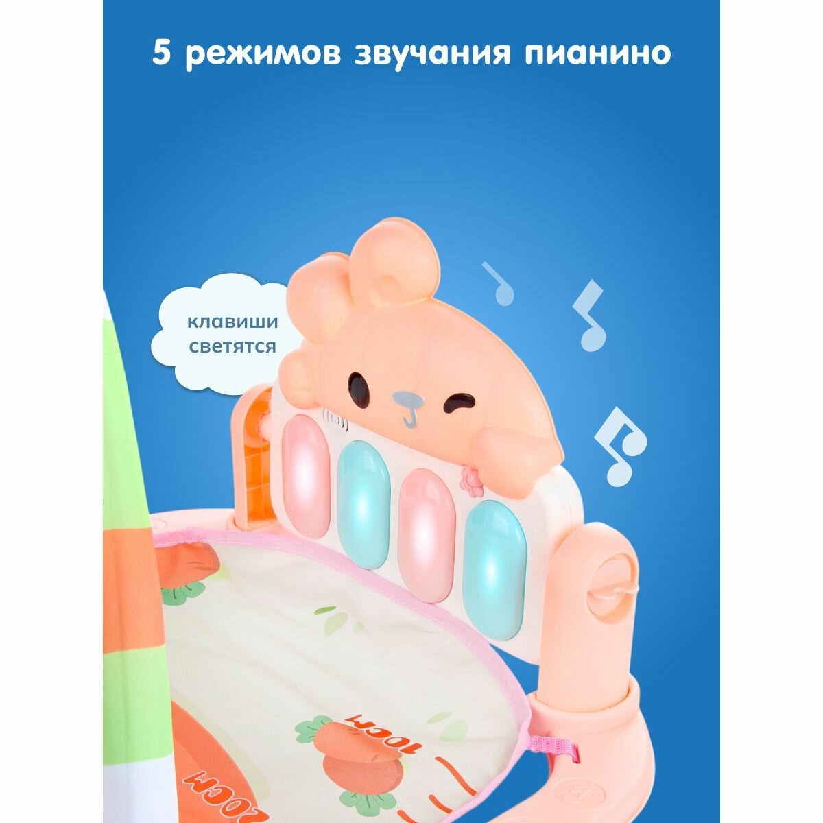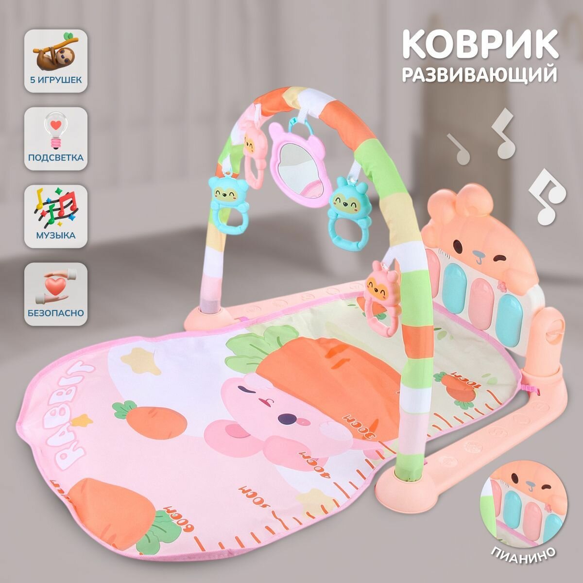 Развивающий коврик для новорожденных с пианино свет звук, Veld Co / Игровой коврик 1 дуга, 5 игрушек Зайка с морковкой