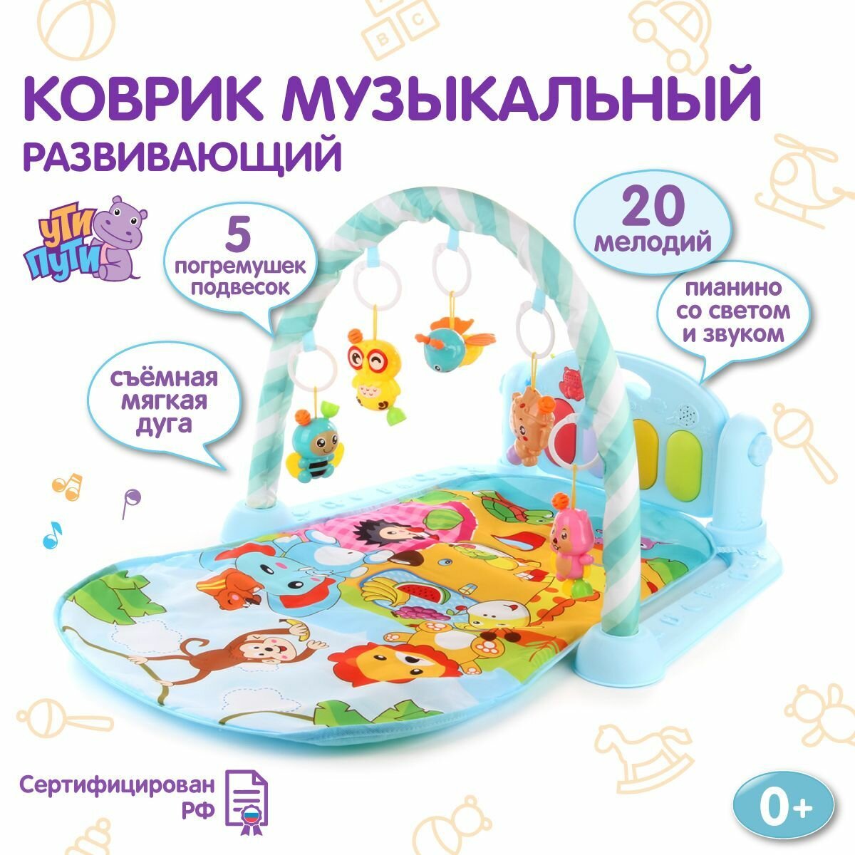 Развивающий коврик для новорожденных с пианино, Ути Пути / Музыкальный игровой коврик, дуга с игрушками для малышей / Подвесные игрушки-погремушки для детей, 106193 информация: