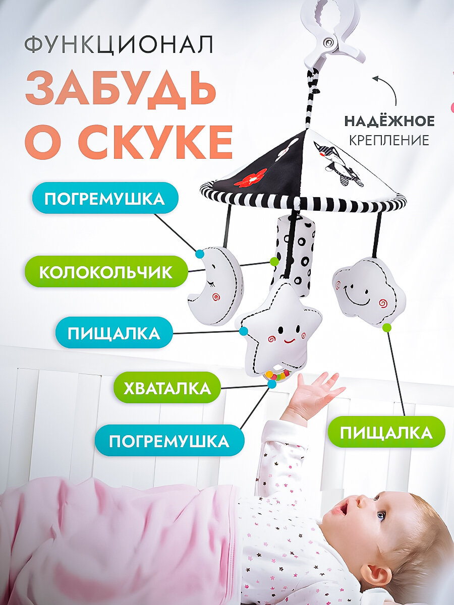 Мобиль-погремушка SHARKTOYS "Звезда", текстиль/пластик, вращение, для детей, белый/черный информация: