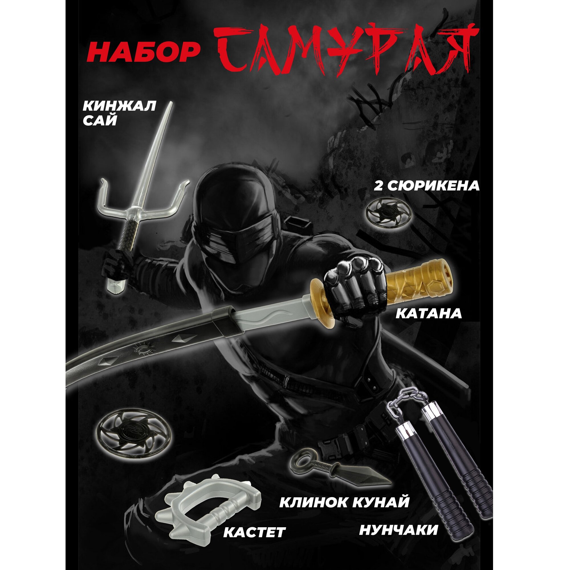 | В комплекте | кастет, кинжал, нунчаки, самурайский меч |