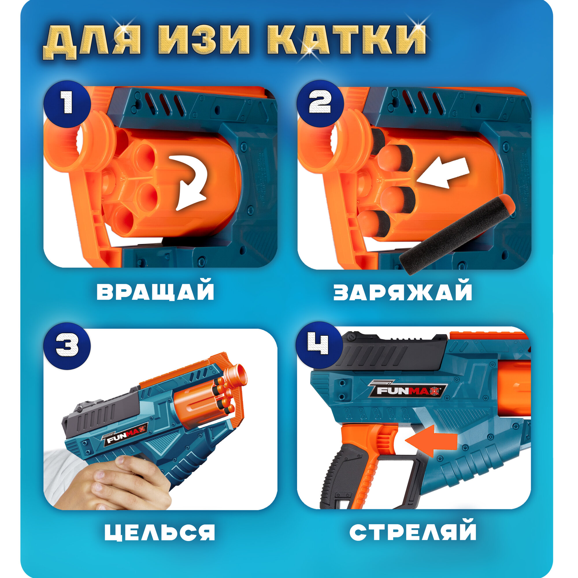 Отзывы на 1toy Funmax "M21" бластер механический, барабан на 6 выстрелов, в комплекте 12 EVA снарядов