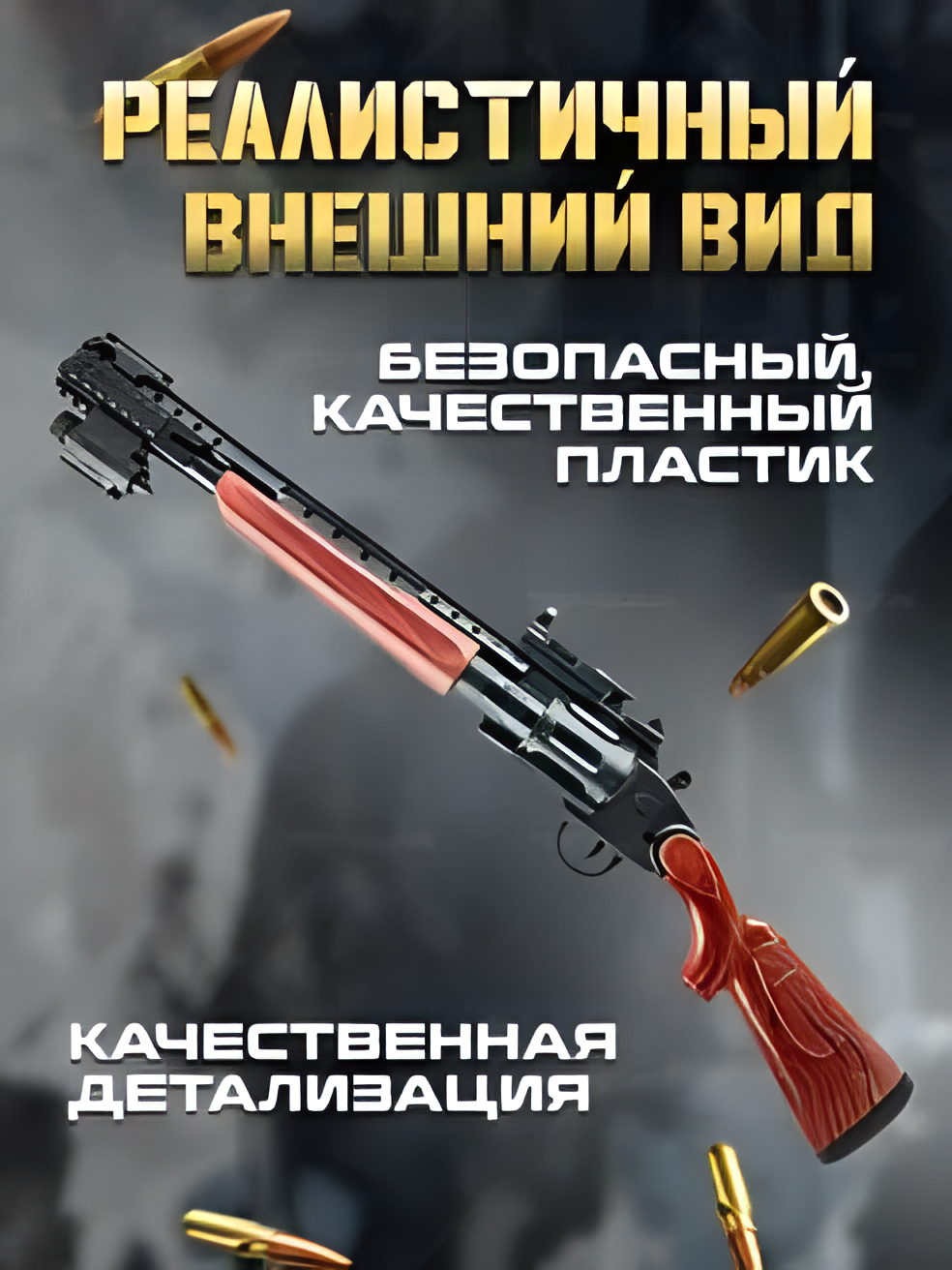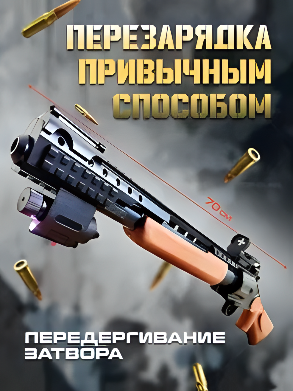Игрушечный пистолет бластер ( дробовик ) с прицелом, выбросом гильз и комплектом мягких патронов / коричневый
