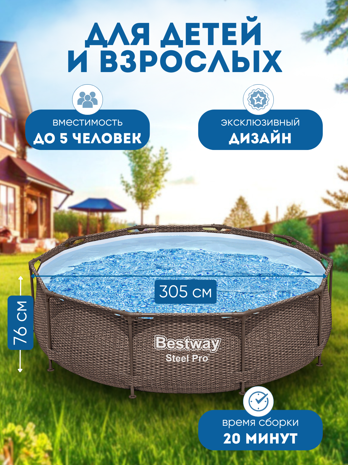 Отзывы на Бассейн каркасный круглый Bestway Steel Pro 305 х 76 см 561JE, ротанг