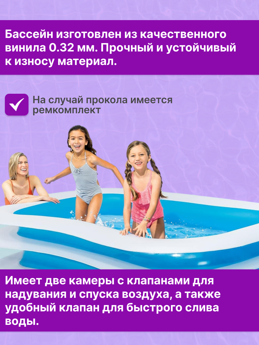 Отзывы на Бассейн надувной INTEX прямоугольный, размеры 262х175х56 см. Семейный бассейн (в коробке)