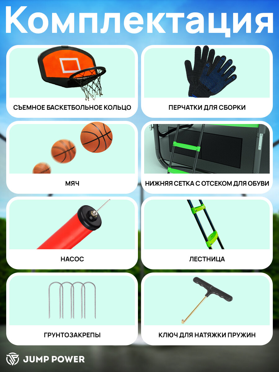 Отзывы на Батут Jump Power, 306см, зелёный, W-опоры, баскетбольное кольцо, батут каркасный с сеткой