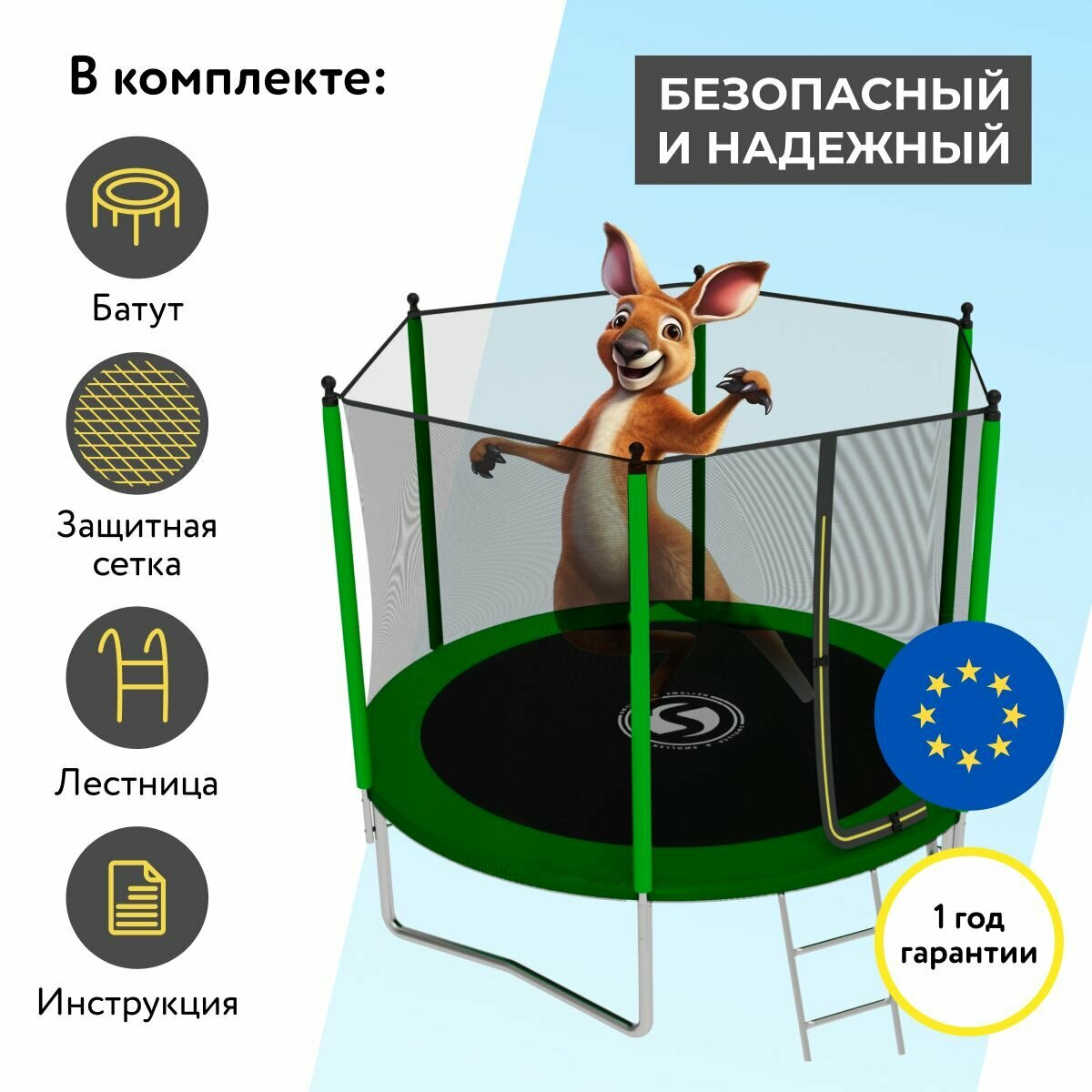 | Состав набора | Батут; Защитный мат; Верхняя защитная сетка; Инструкция по эксплуатации; Гарантийный талон |