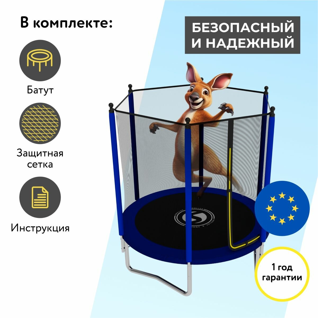 | Состав набора | Батут; Защитный мат; Верхняя защитная сетка; Инструкция по эксплуатации; Гарантийный талон |