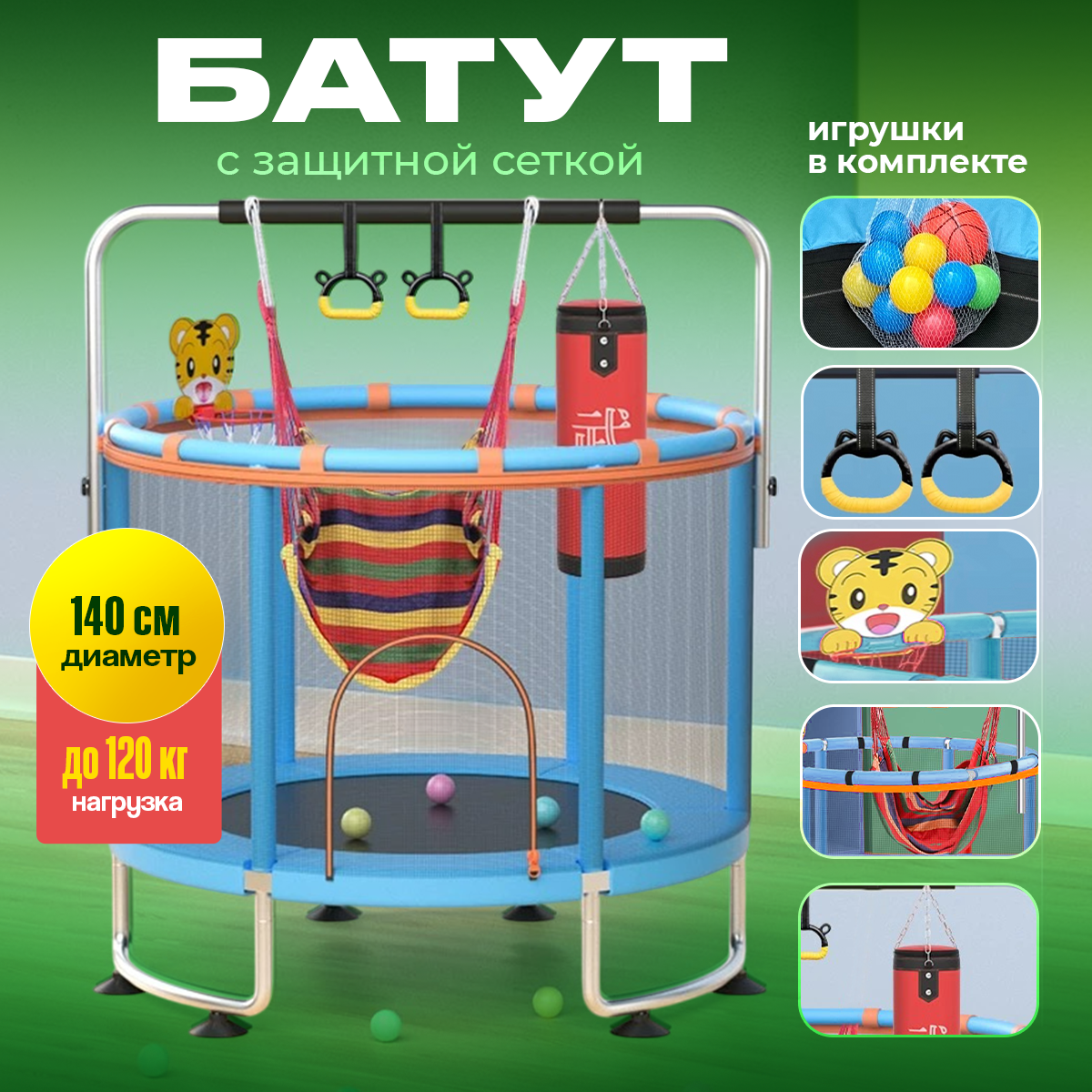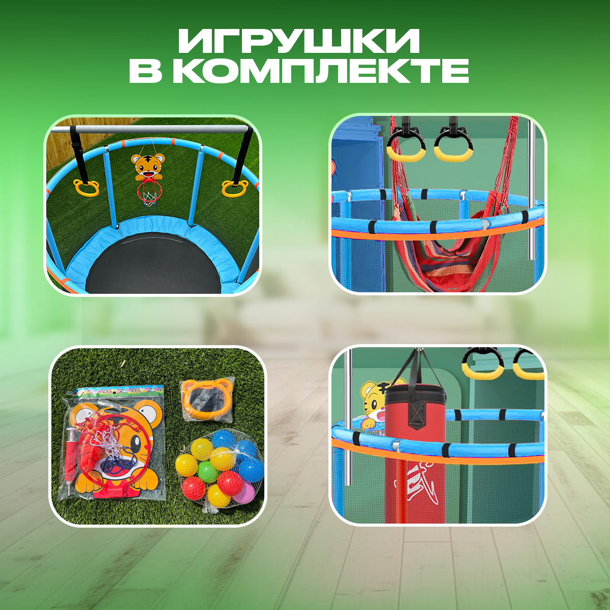 | Состав набора | 1.Трубки каркаса сетки с мягкими накладками - 6 шт 2.Изогнутые трубки каркаса - 6 шт 3.Поперечные соединения - 6 шт 4. U-образные ножки - 3 шт 5.Пружины - 36 шт 6.Ключ для натягивания пружин - 1 шт 7. Ножки-присоски - 6 шт 8.Защитная сетка -1 шт 9.Высокоэластичная ткань для прыжков - 1 шт 10.Изогнутые трубки каркаса с мягкими накладками - 6 шт 11.Детали ручки - 3 шт 12.Игрушки (мяч+насос,шарики,кольцо для мячей,подвесные ручки) |