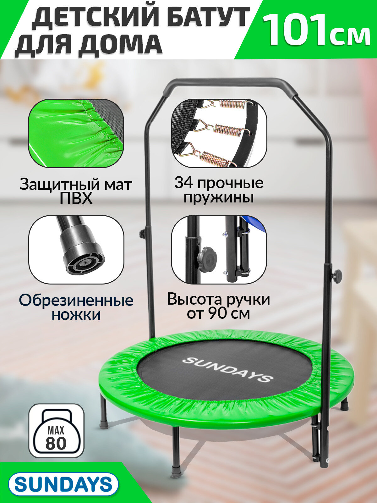 Отзывы на Батут с ручкой Sundays D101 см (зеленый), батут для дома, батут спортивный, фитнес батут, активные игры
