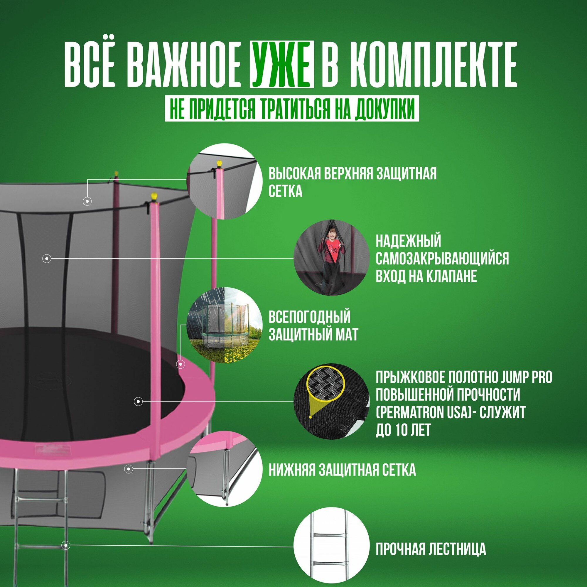 | Состав набора | каркас батута, комплект пружин, защитный мат, верхняя защитная сетка, нижняя защитная сетка, лестница, ключ для установки пружин, набор инструментов и крепежей |