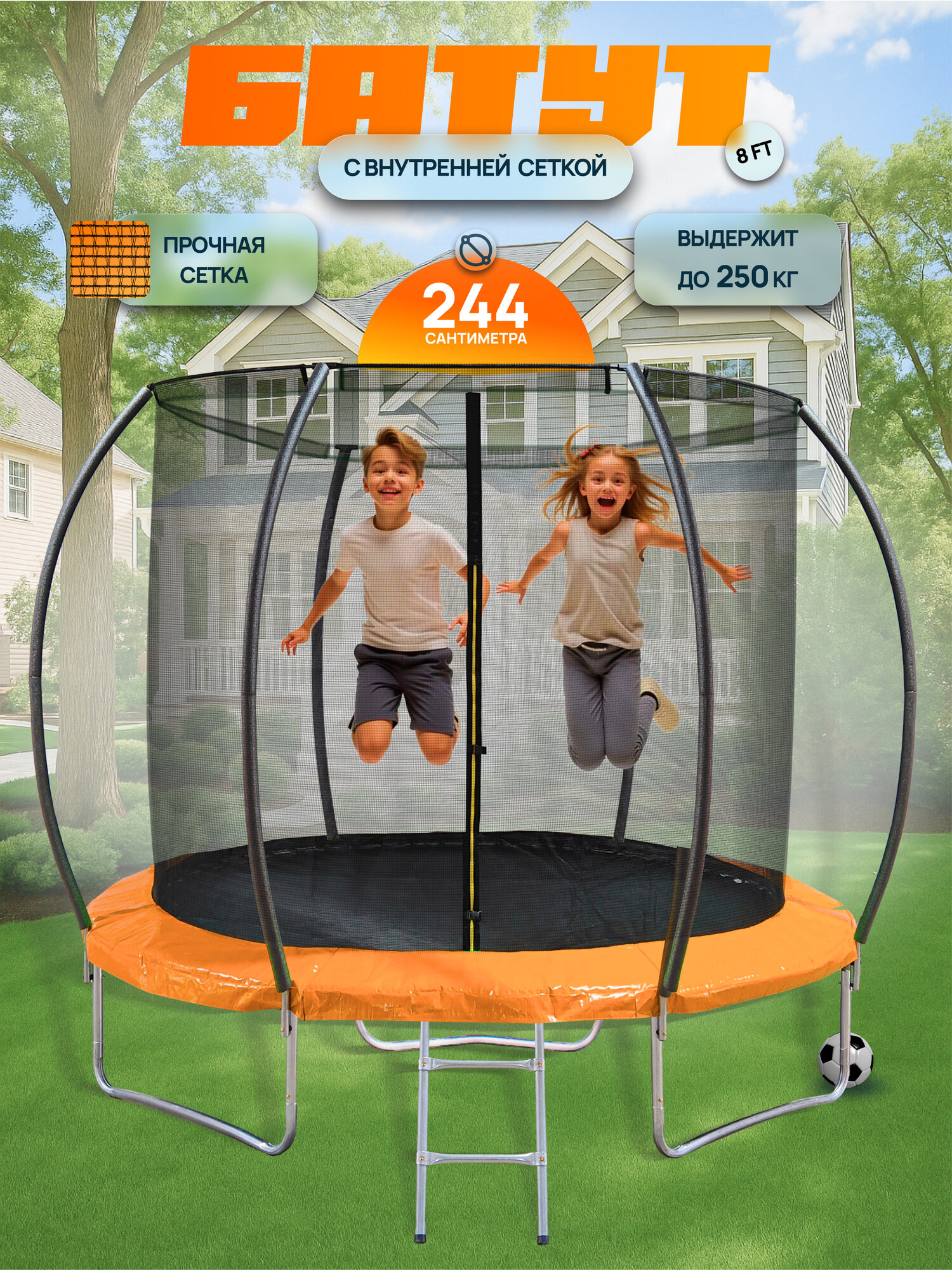 Батут BIG 8FT, каркасный, детский, уличный, с защитной сеткой, 244x210см информация:
