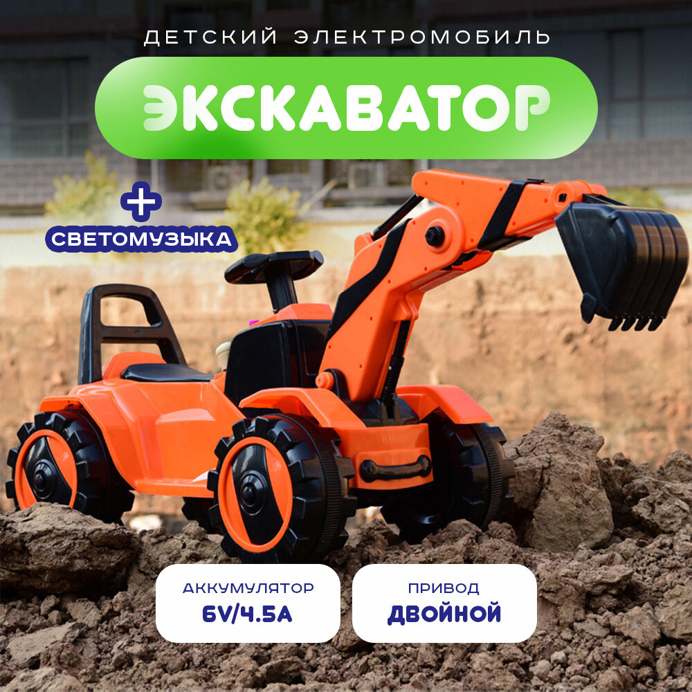 Электромобиль детский "Экскаватор", подсветка и музыка, двойной привод на аккумуляторе оранжевый информация: