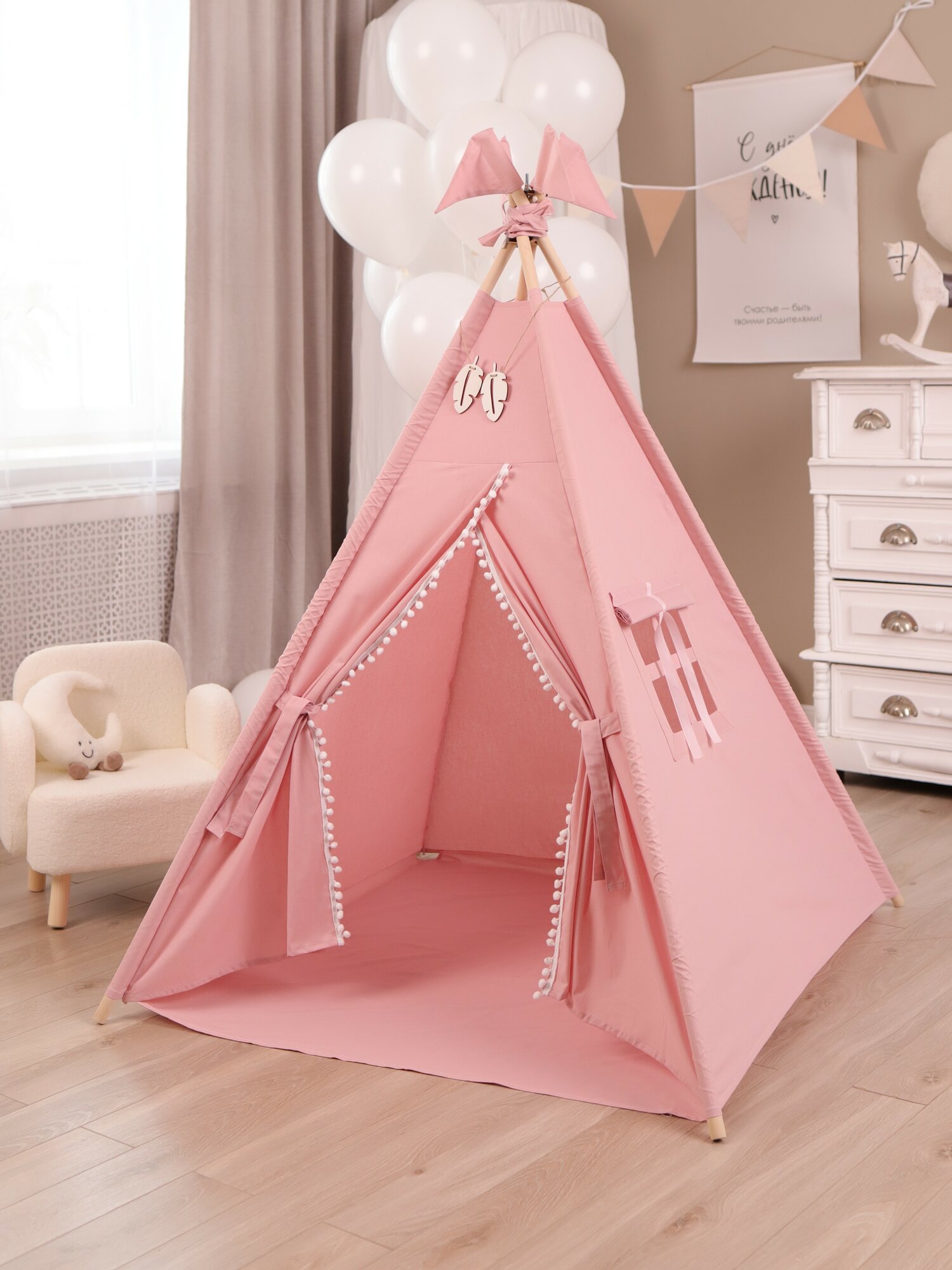 Отзывы на Вигвам Палатка детская игровая, домик для детей, 2 подушки, корзина для игрушек, кемпинговая лампа, гирлянда из флажков