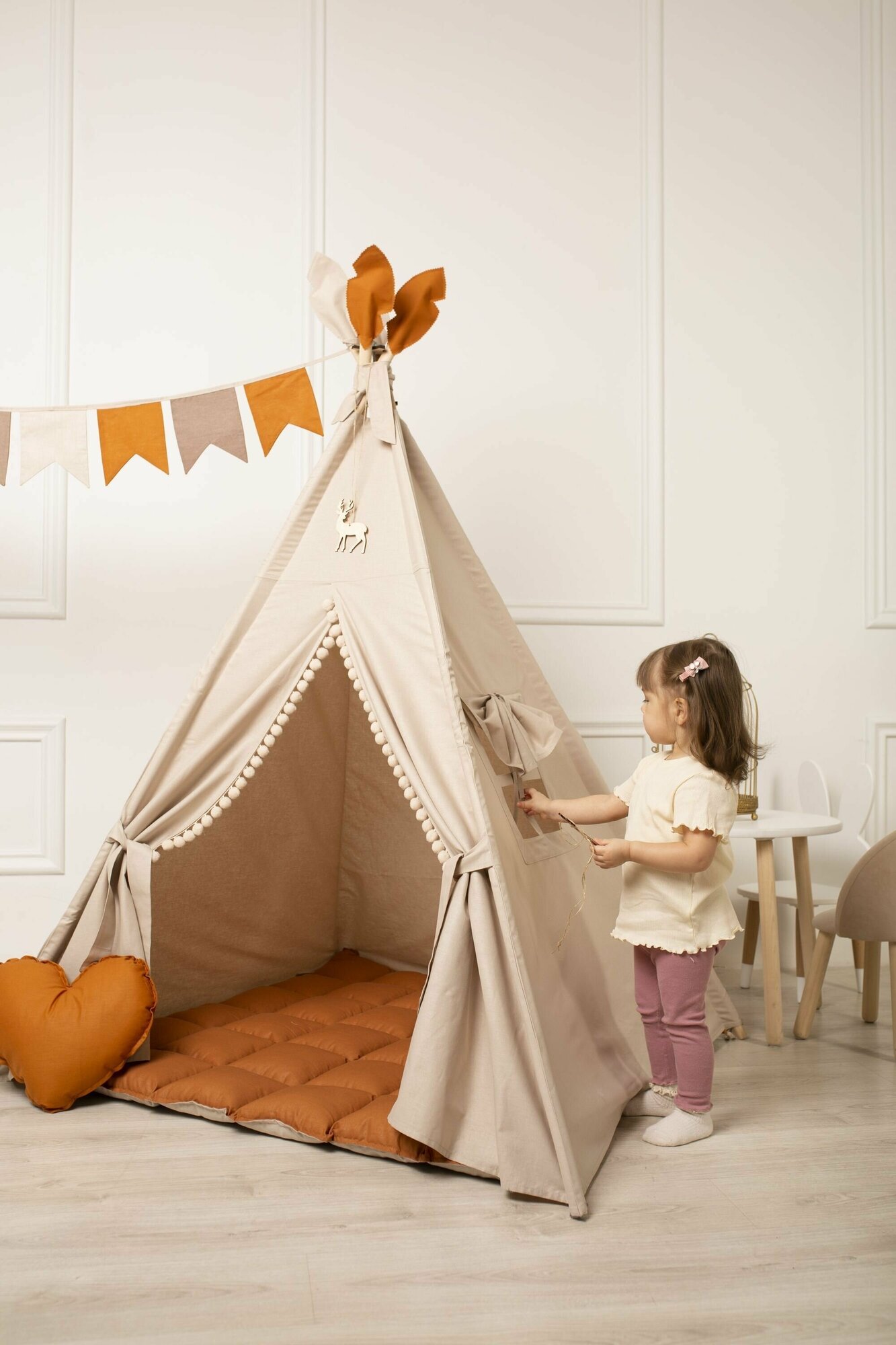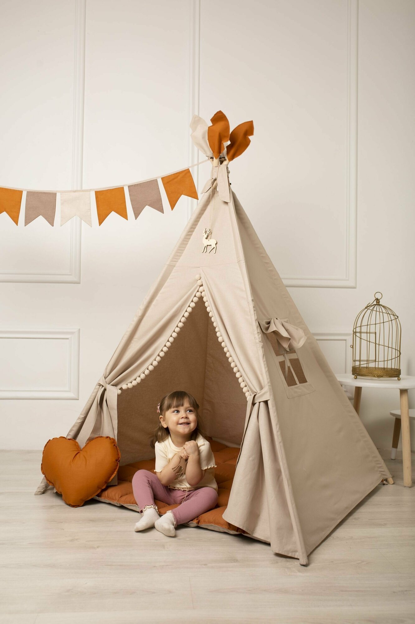 Вигвам детский с ковриком, окошком , подушкой и антискладывателем бежевый горчичный с флажками