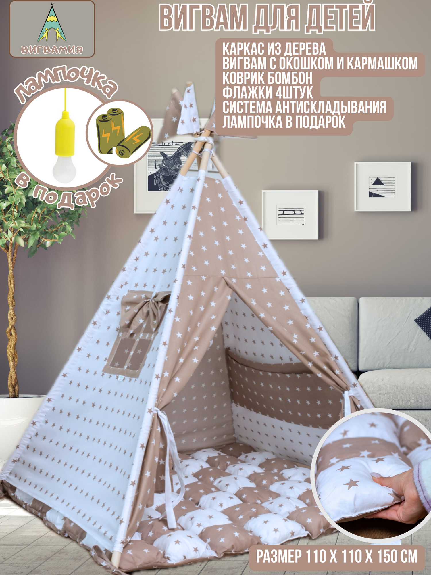 Отзывы на Вигвам детский "Молочный шоколад" с ковриком "Бомбон" и флажками