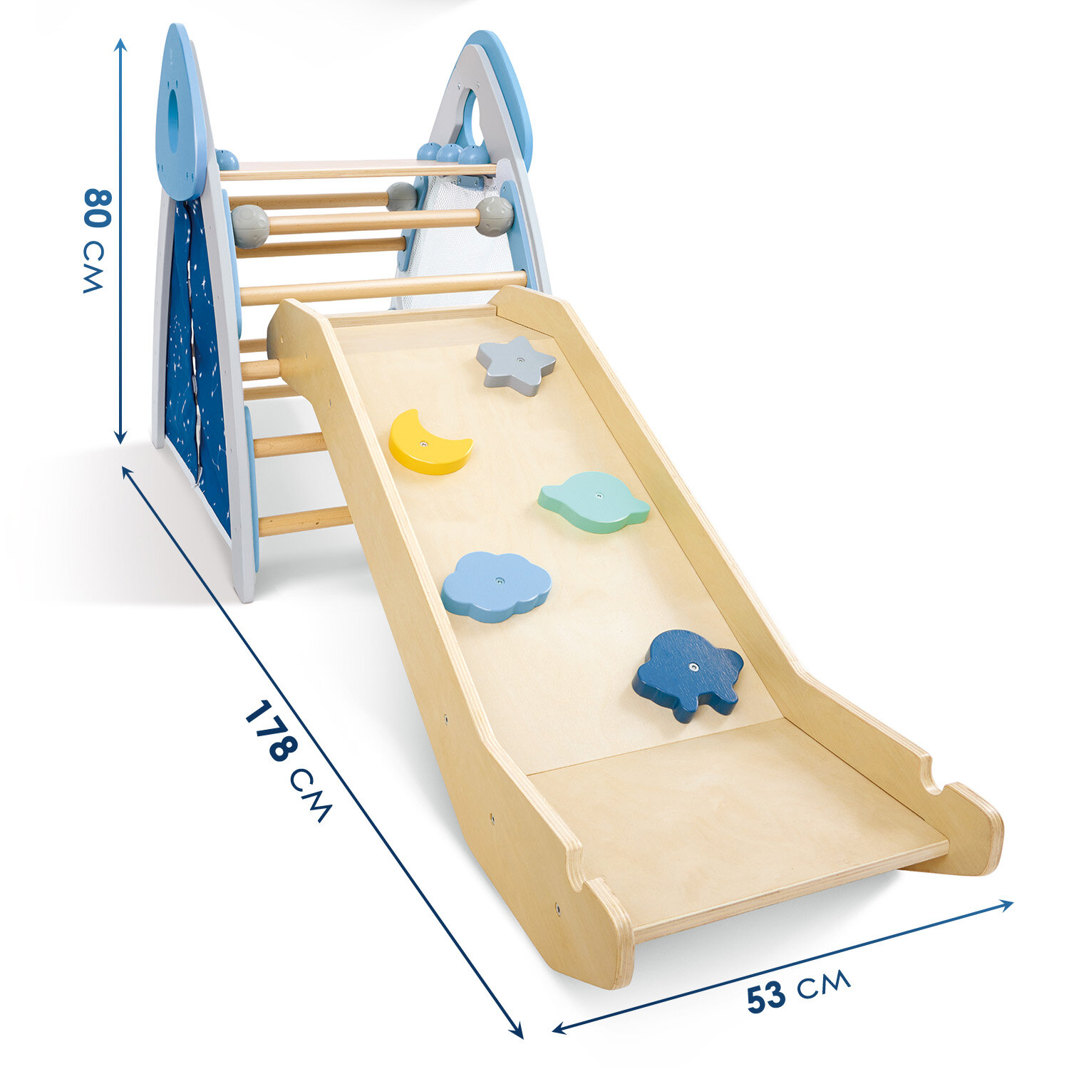 | Комплектация | двустороння горка (одна сторона - гладкая, другая - с выпирающими формами для лазания), палатка-лесенка, шторка для палатки, сетка |