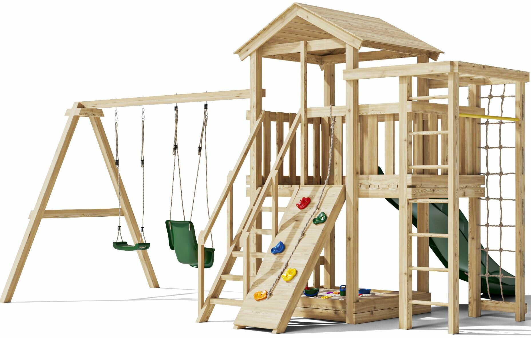 | В комплекте | брусья, домик, качели, лестница, песочница, сетка для лазания, Волнистая горка, Игровая веранда, Игровой модуль, Крыша, Перила |