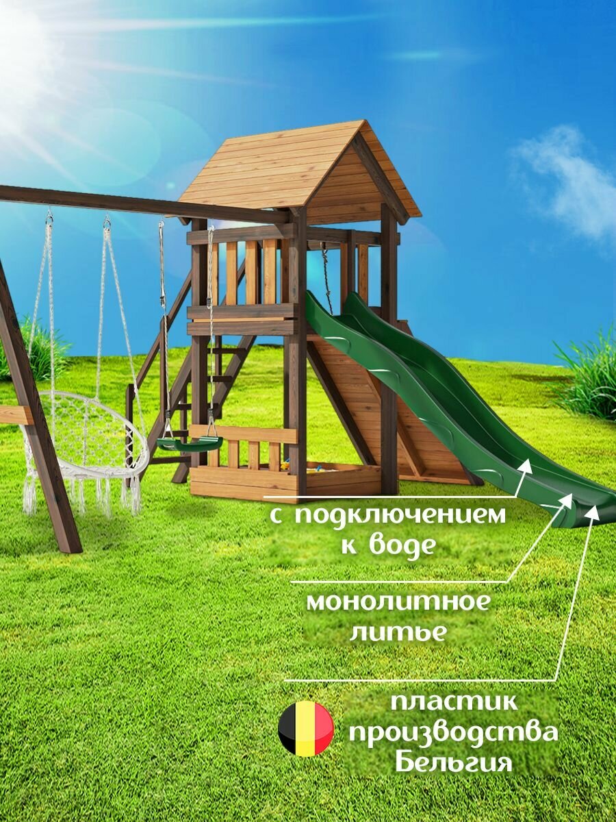 | В комплекте | брусья, домик, канат, качели, лестница, песочница, скалолазная стенка, Волнистая горка, Игровая веранда, Игровой модуль, Крыша, Перила |