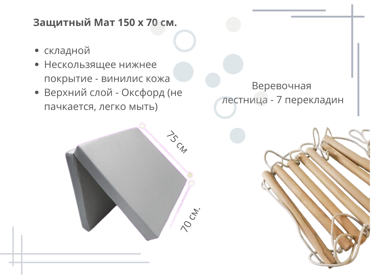 | В комплекте | веревочная лестница, гимнастические кольца, домик, канатный лаз, лестница, мат, рукоход, сетка для лазания, турник |