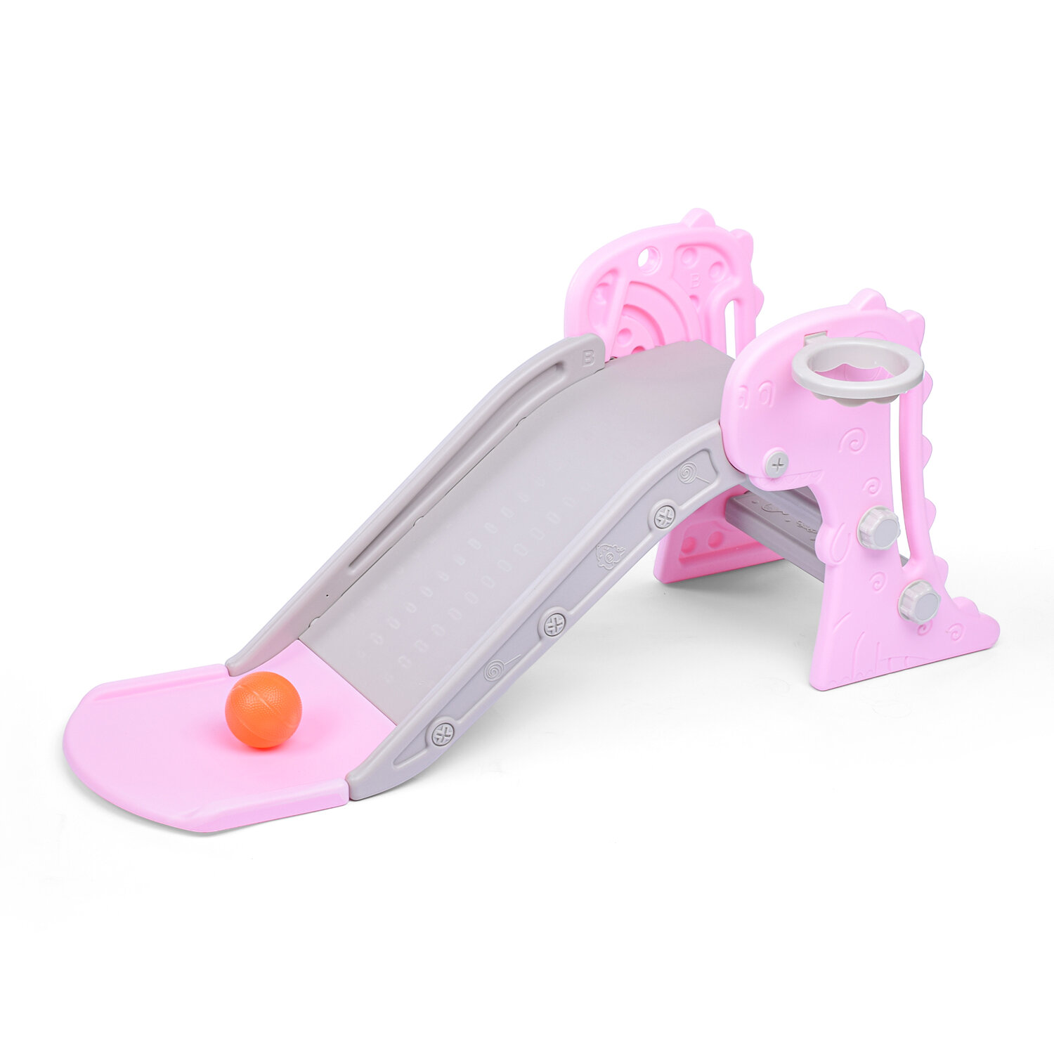 Горка детская пластиковая "Динозаврик" от1 до 3 лет. С баскетбольным кольцом. Мяч в комплекте (цвет розовый) информация: