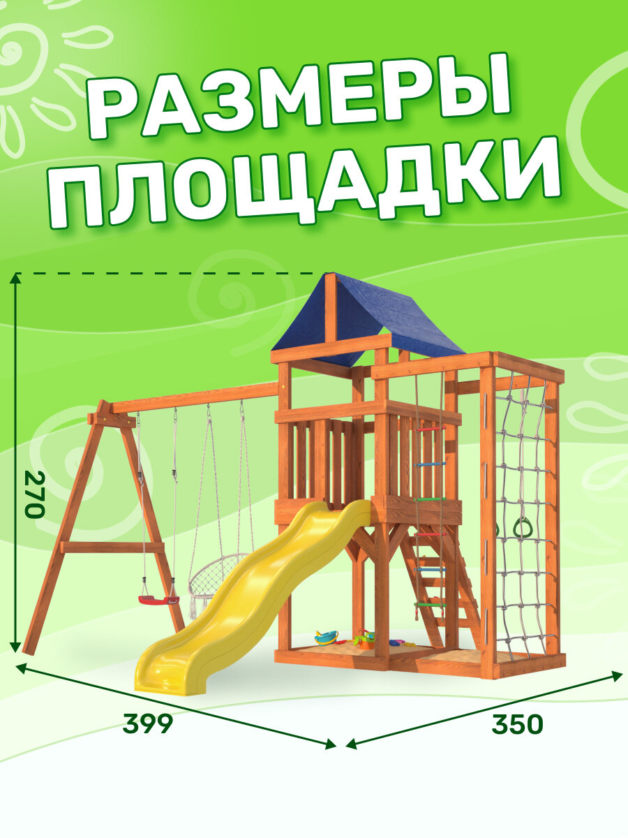 | Комплектация | Башня с тентом, подвесные качели лодочка, плетенное кресло, сетка стенка, горка, скалодром, песочница под башней, кольца. |