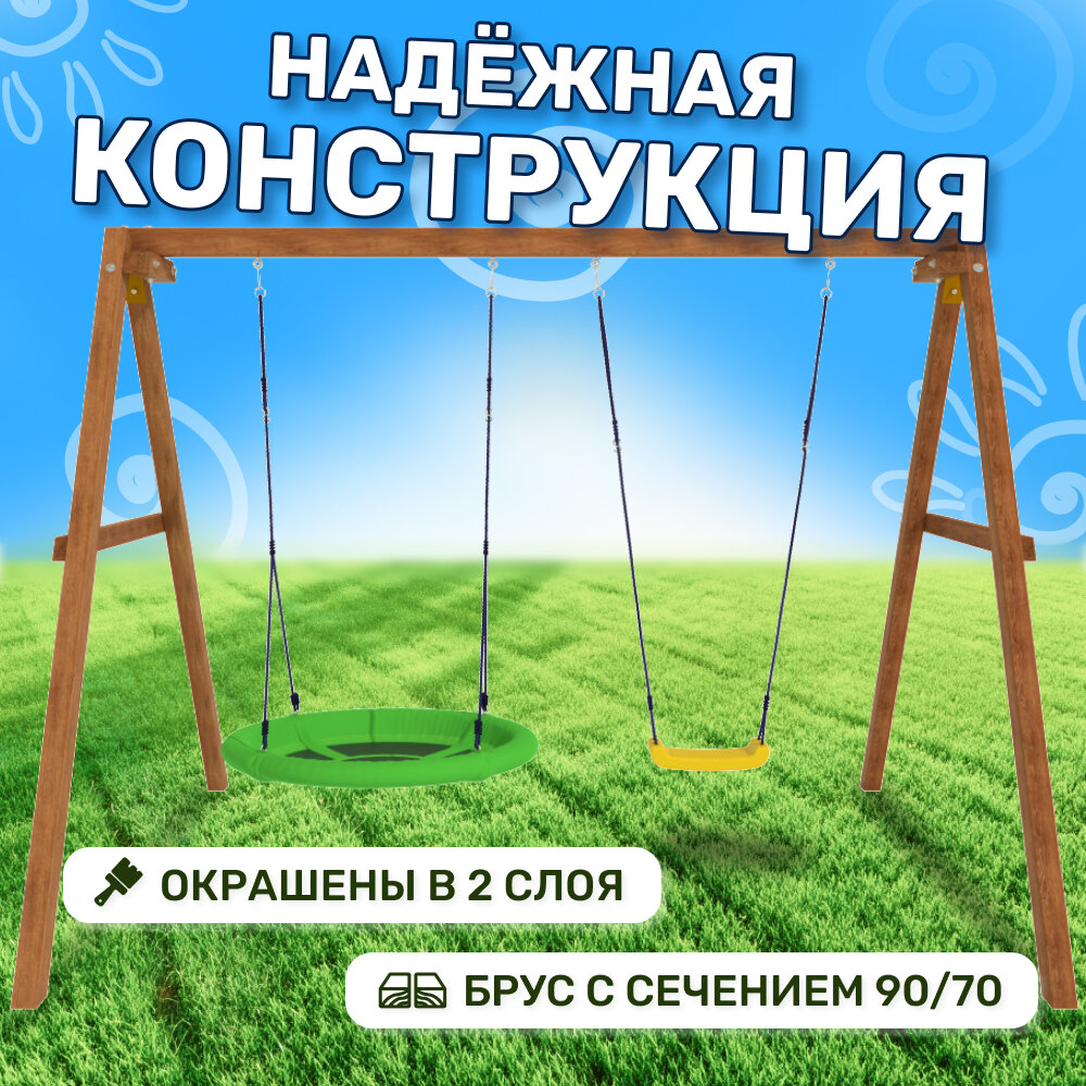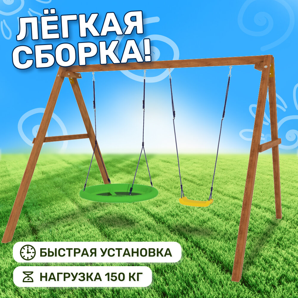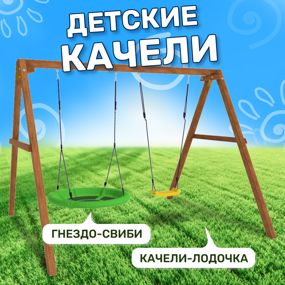 | Комплектация | Деревянный каркас, качели гнездо Свиби и лодочка, карабины и кронштейны. |