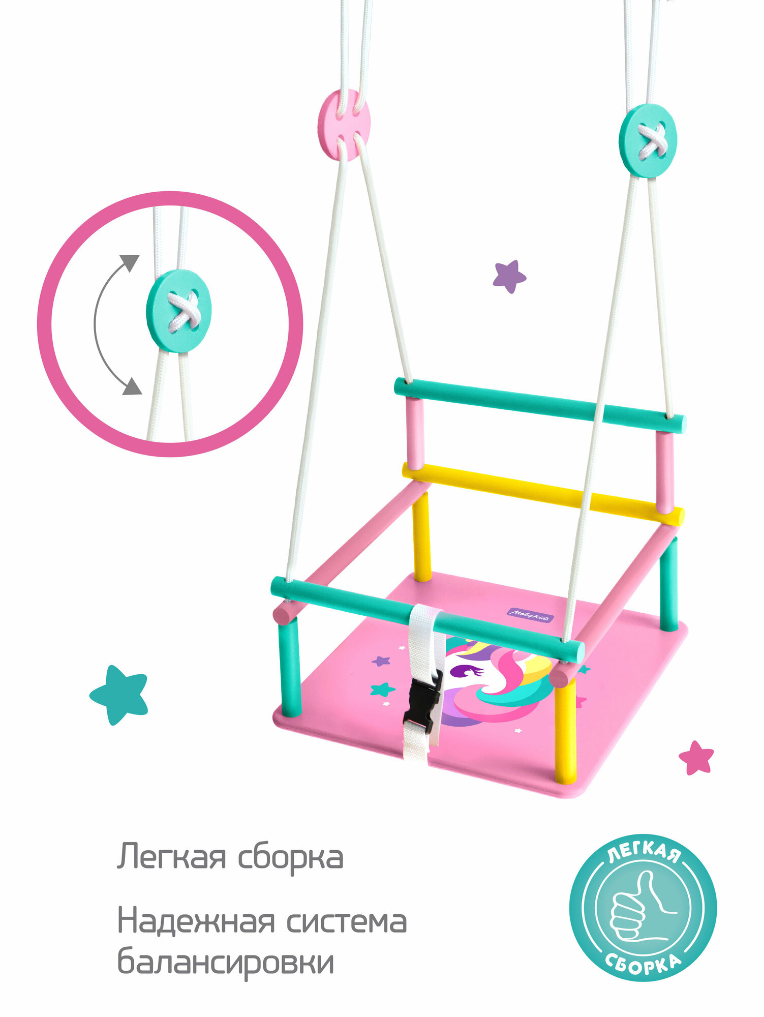 Отзывы на Качели детские подвесные деревянные с рисунком Moby Kids "Комета" Единорог, максимальная нагрузка 35 кг