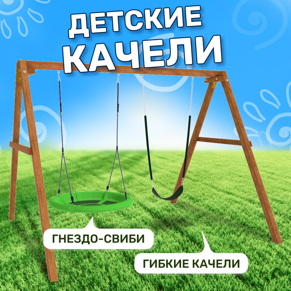 | Комплектация | Деревянный каркас, гибкие качели и гнездо Свиби, карабины и кронштейны. |