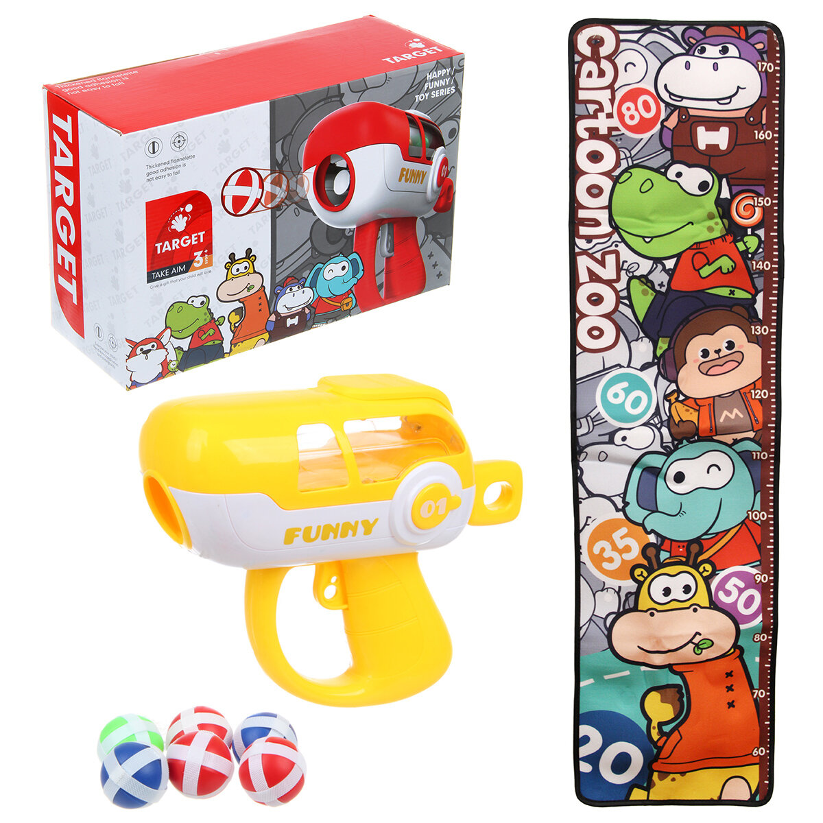 | Комплектация | коврик с ростомером, пистолет, 6 снарядов, 5 кружочков для наклеек, 2 крючка, набор наклеек 6 штук |