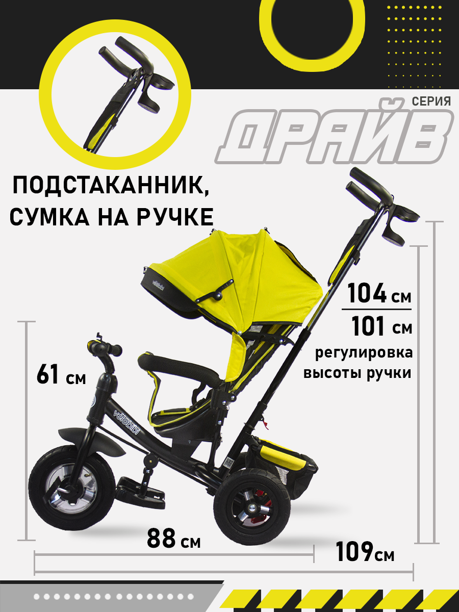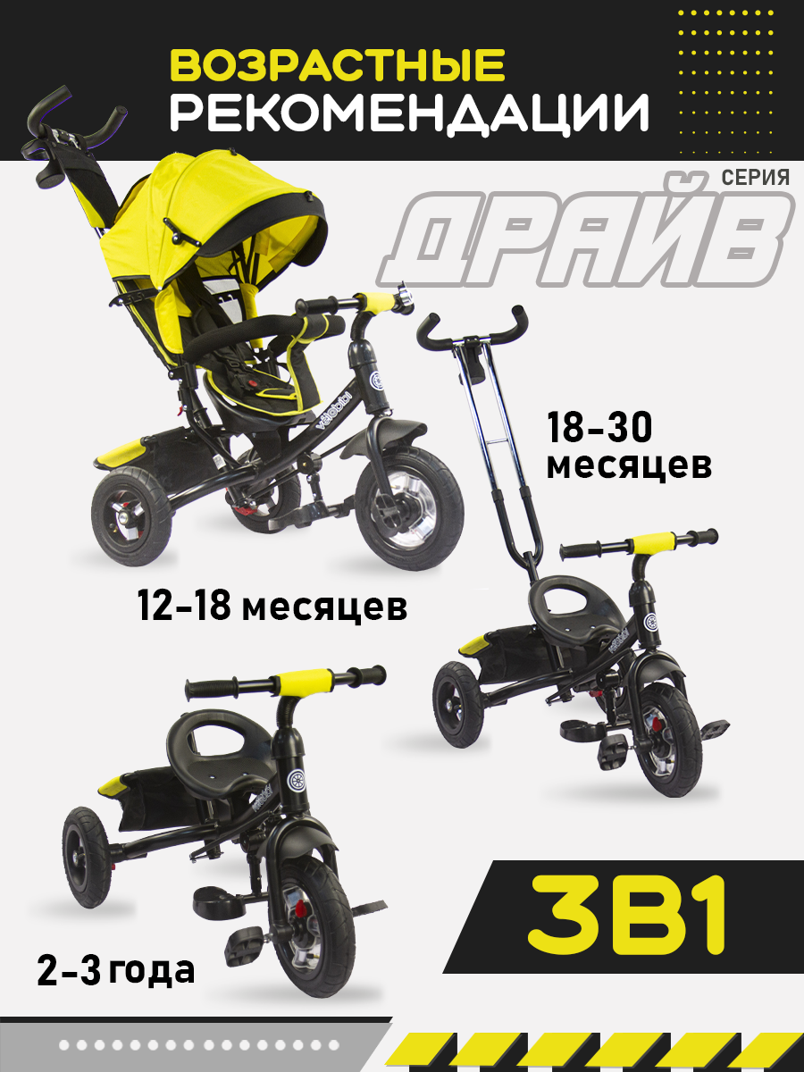Отзывы на Велосипед-трансформер трёхколёсный с ручкой ДРАЙВ (колеса надувные 10"/8", корзина), желтый