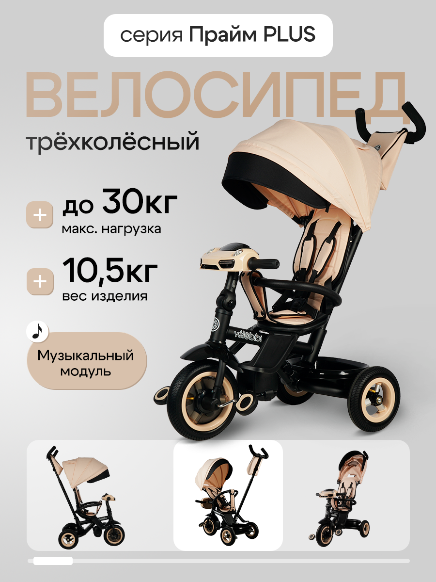 Отзывы на Велосипед трёхколёсный с ручкой ПРАЙМ PLUS, резиновые колеса, музыкальный модуль, бежевый
