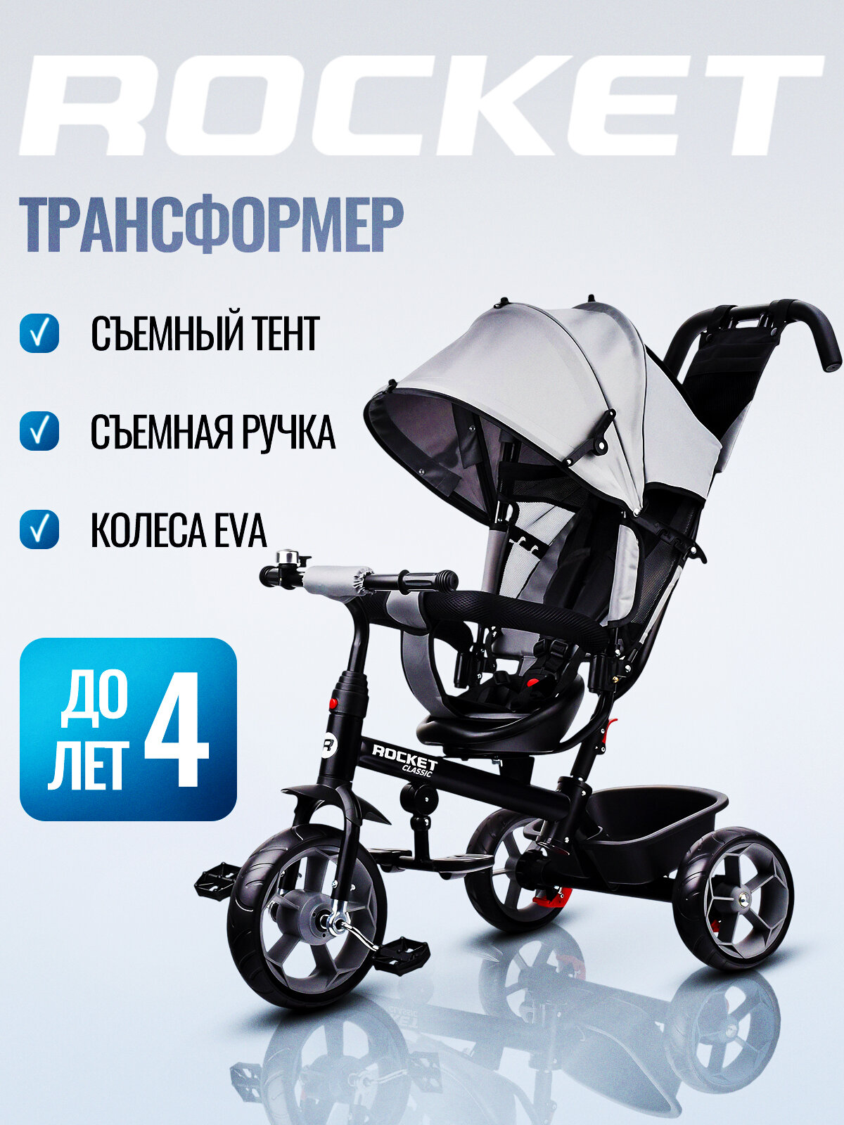 Велосипед Rocket 136 трехколесный с родительской ручкой и козырьком, колеса EVA 10"/8", цвет серый информация: